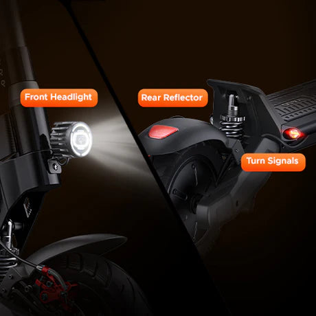 Safety & Lighting: A full lighting setup — headlight, rear and brake lights, and turn signals — improves visibility and safety when riding at night or in low-light conditions.