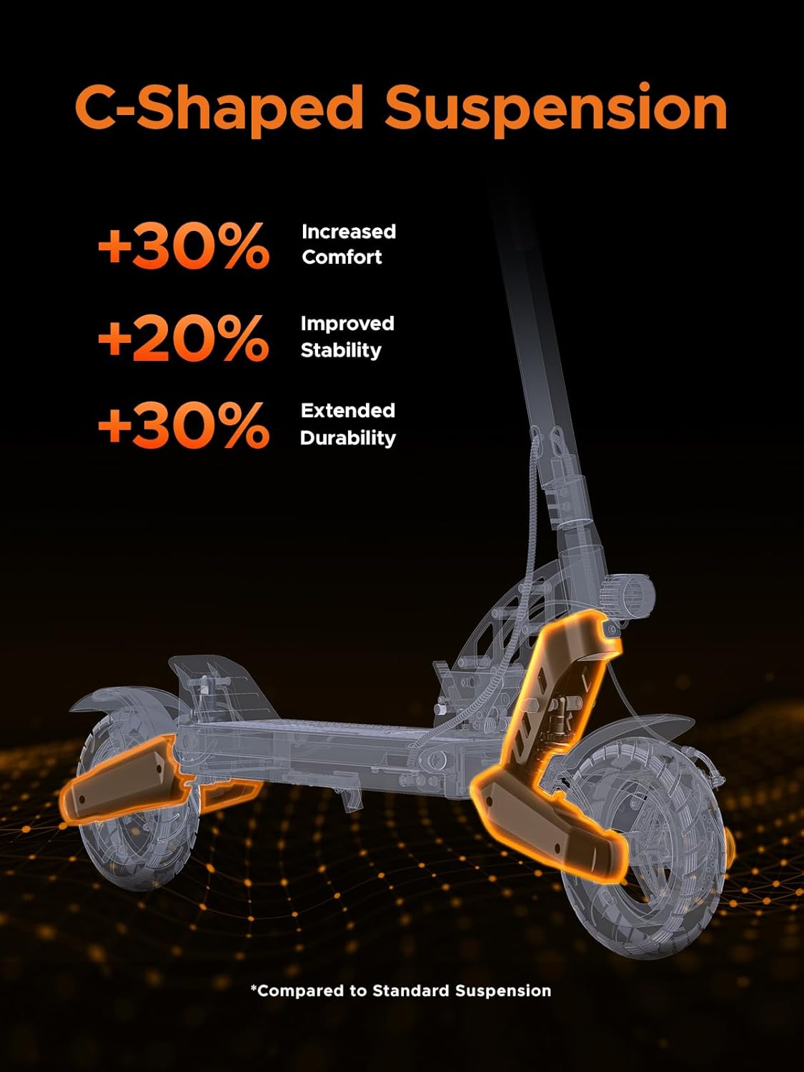 Fat 10″ Pneumatic Tires & Suspension: 10-inch pneumatic tires plus front C-shaped shock absorbers and rear suspension deliver a smooth, stable ride on urban roads, gravel, dirt, or other rough surfaces. This makes the Y400 suitable for mixed urban/off-road use.