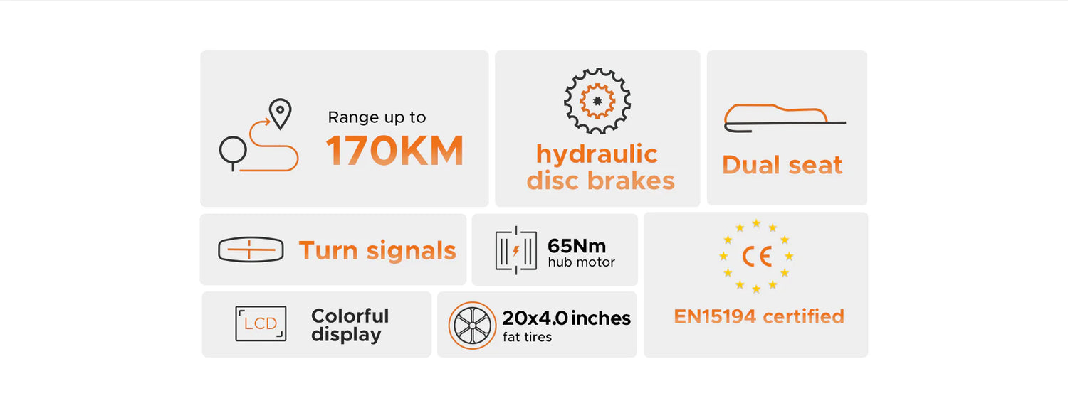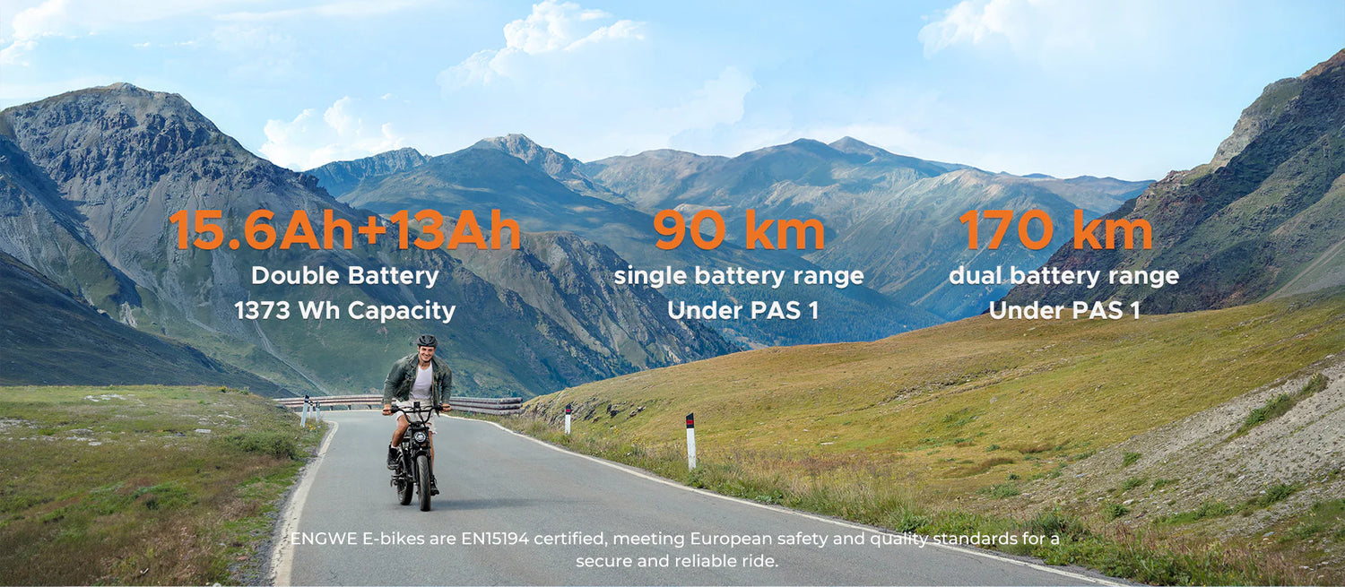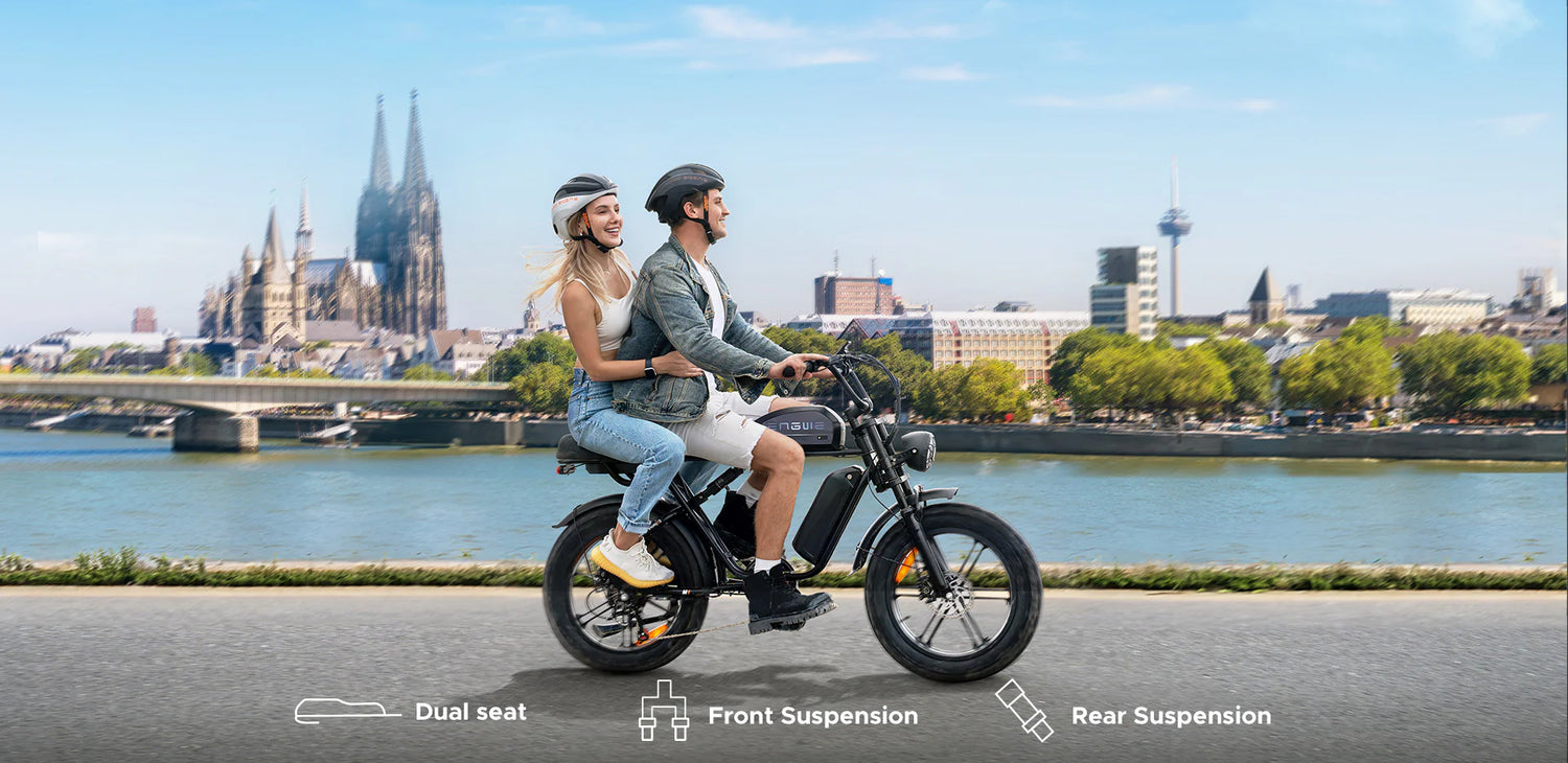 Mit einem kraftvollen 48V 250W bürstenlosen Motor und 65 Nm Drehmoment, einer Doppelakku-Konfiguration für bis zu 150 km Reichweite im PAS 2-Modus, hydraulischen Scheibenbremsen und weicher Federung, garantiert das ENGWE M1 ein angenehmes Fahrerlebnis – auch für zwei Personen.