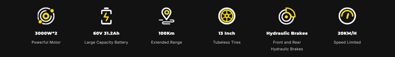 ΚΙΝΗΤΗΡΕΣ 6600W(2*3000W) - ΡΟΠΗ 90 Nm - ΑΥΤΟΝΟΜΙΑ 100-120 KM - ΜΠΑΤΑΡΙΑ 60V 40AH - ΤΑΧΥΤΗΤΑ 25KM/H (ΜΠΟΡΕΙ ΝΑ ΞΕΚΛΕΙΔΩΘΕΙ)