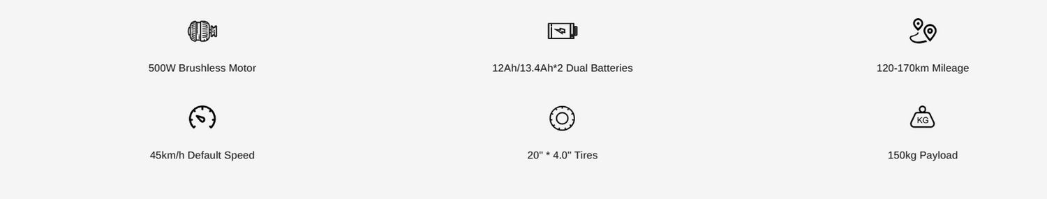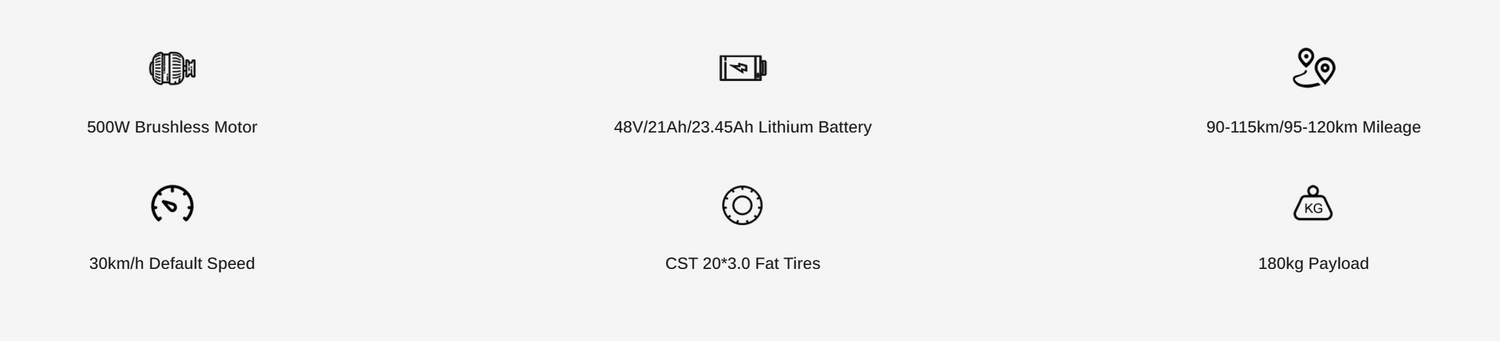 500W (880W Peak) motor with 65Nm torque - Dual 48V 10.8 Ah batteries - Dual hydraulic brakes - Rear rack - Autonomy 100 km