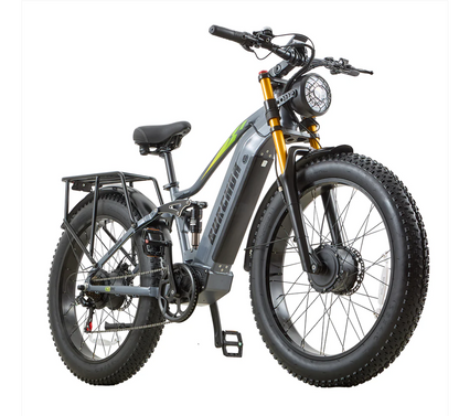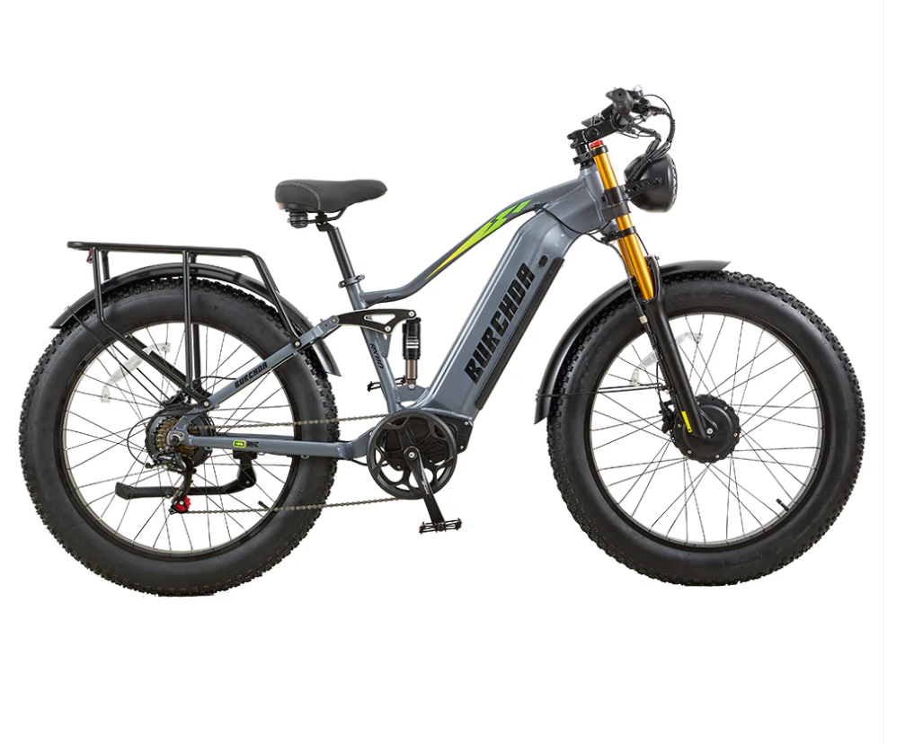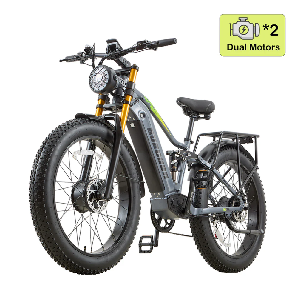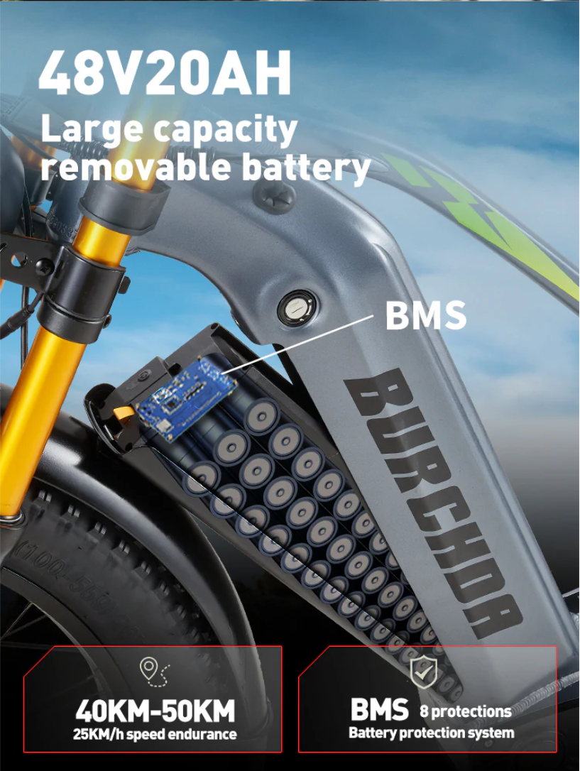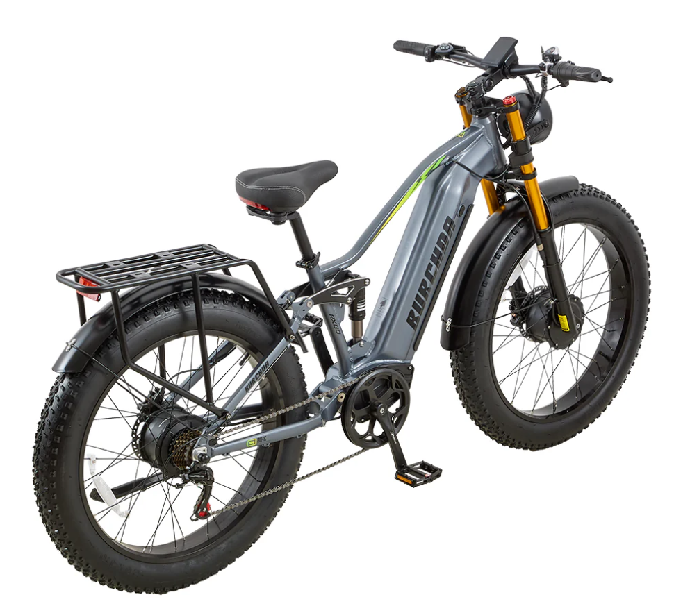 The Burchda RX80 Upgraded is a powerful full-suspension fat-tire e-bike built for off-road and adventure. It features a 1500W peak motor (95 Nm torque), a 48V 20Ah removable battery with up to 65 km range, and a top speed of 45 km/h. With 26″ × 4.0″ tires, dual suspension, and hydraulic disc brakes, it delivers stability, comfort, and safety on any terrain. Comes with fenders, rack, phone holder, helmet, and more — plus free EU shipping, 30-day returns, and a 3-year warranty.