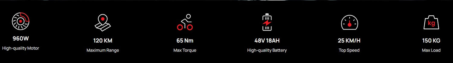 The built-in 48V 18Ah lithium battery delivers up to 120 km of assisted range per charge
