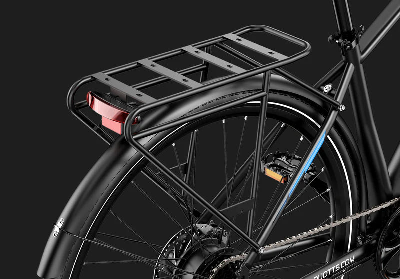 Comes fully equipped with full-coverage mudguards, durable alloy pedals, and a steel rear rack supporting up to 25kg