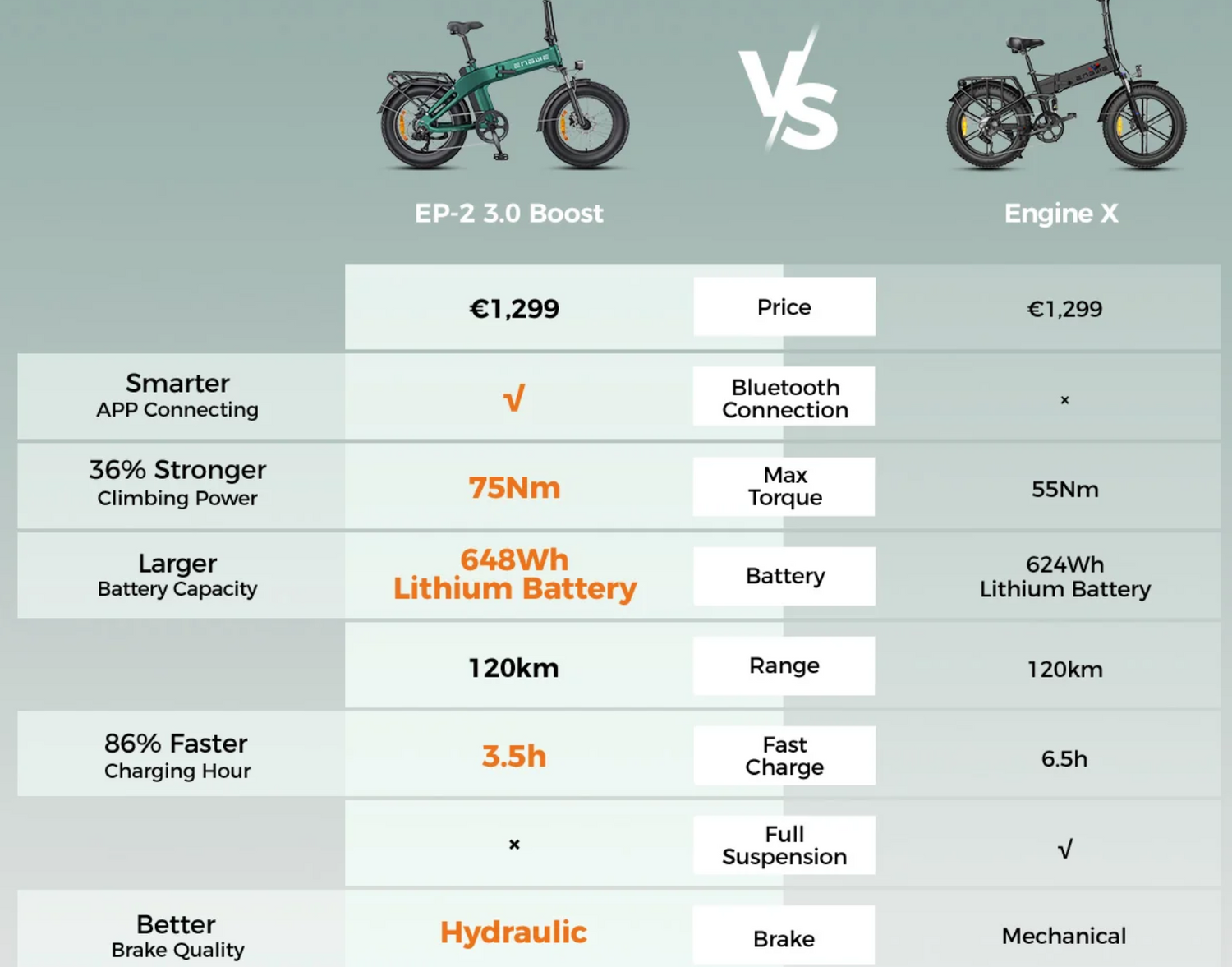 The ENGWE EP-2 3.0 Boost is a foldable fat-tire e-bike combining power and convenience. With a 75 Nm motor, 48V 13.5Ah removable battery offering up to 120 km range, and 20″ × 4.0″ tires with front suspension, it’s built for both city and off-road rides. Features include hydraulic disc brakes, a Shimano 7-speed drivetrain, 3.5 hrs fast carging and a supper clear smart LCD display with app connectivity — all in a compact, foldable design