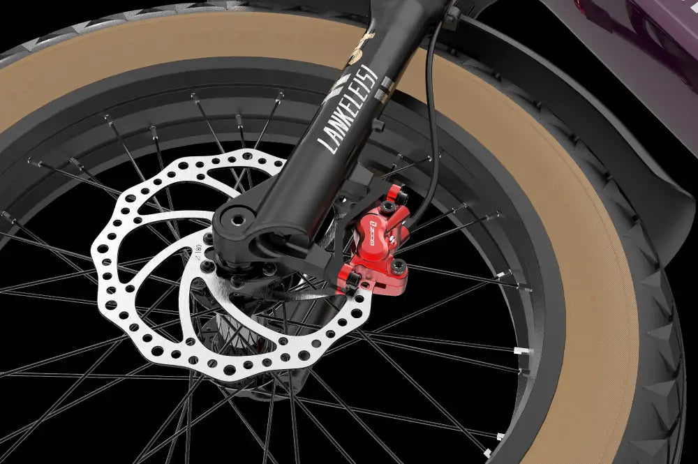 The Lankeleisi GOFL-X features a lockable front suspension fork with 100mm travel and a seat post suspension, providing superior comfort and shock absorption. Paired with 20*4.0 fat tires, it effortlessly handles city streets and uneven terrains with stability and ease.